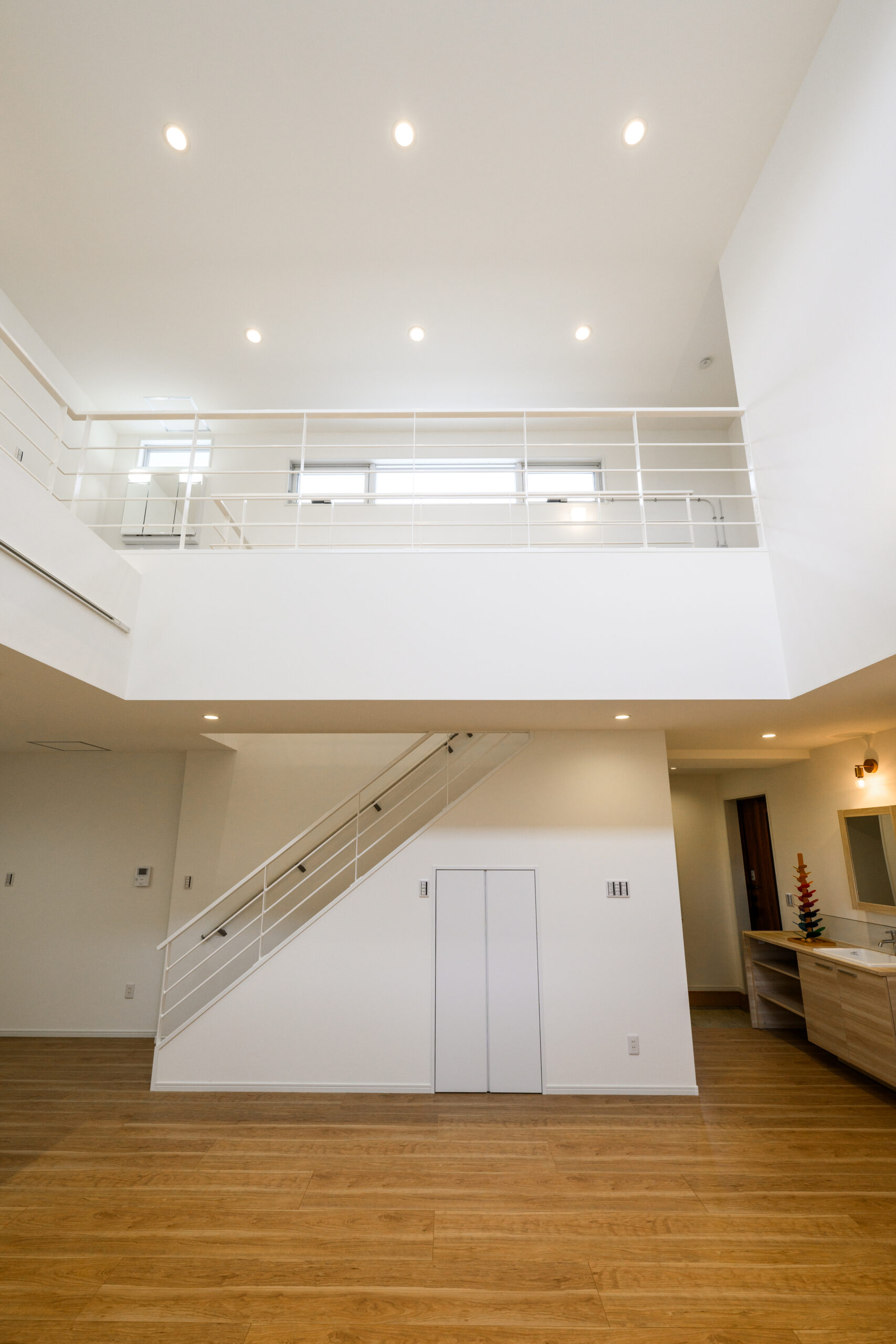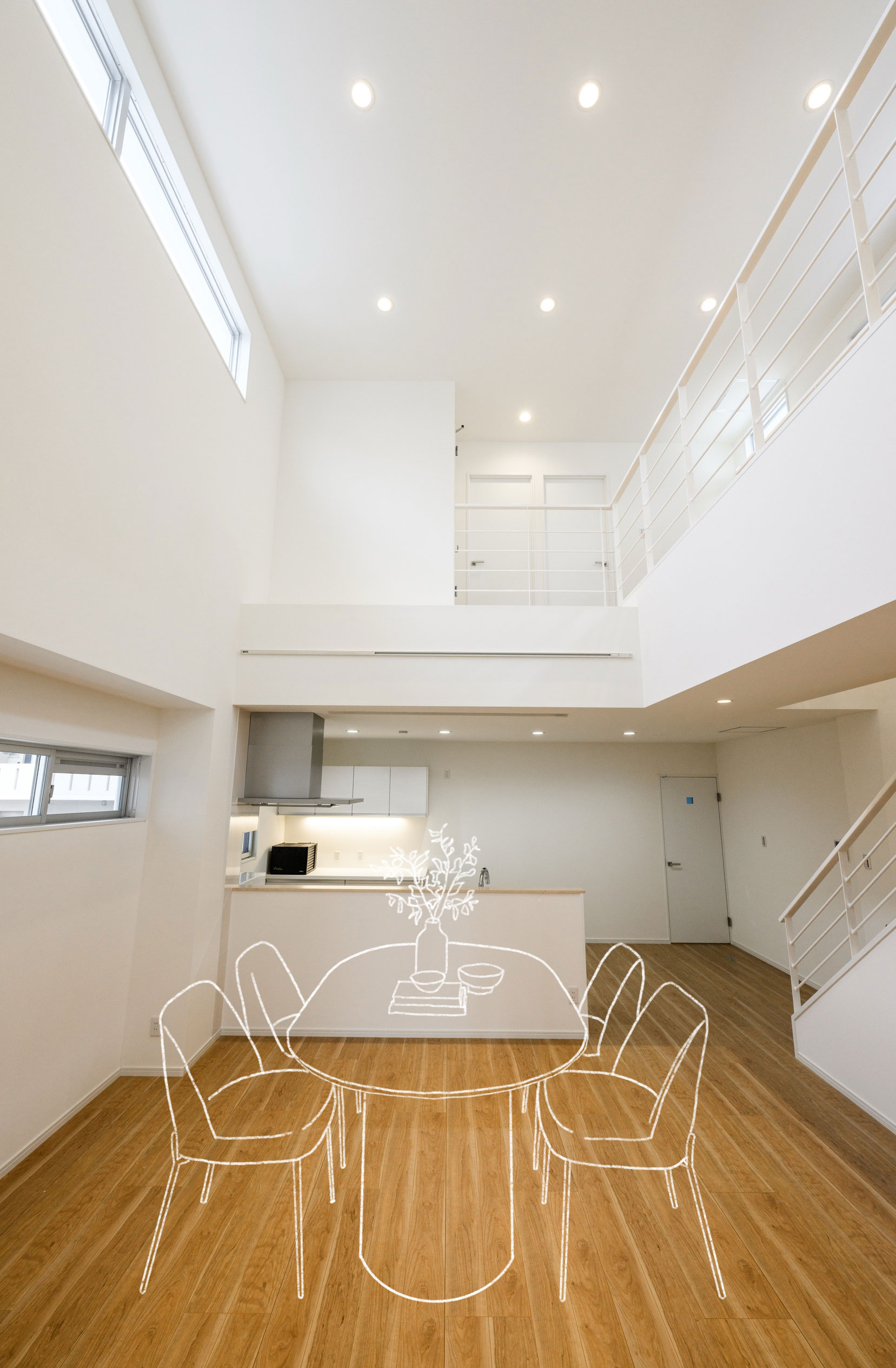 層分の天井高をもつ吹抜け空間。その高さを活かすため、色も素材も、できるだけ削ぎ落としました。