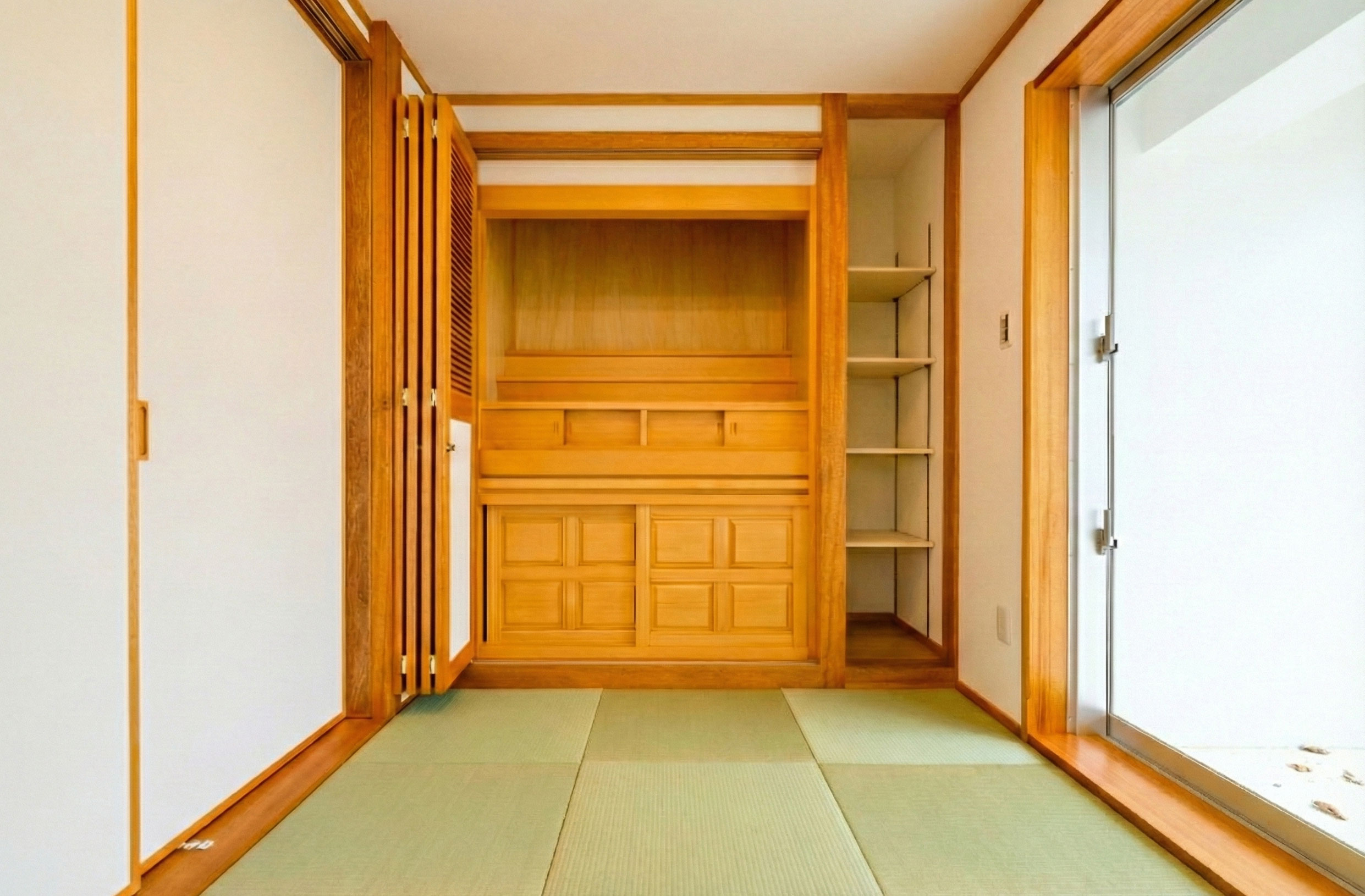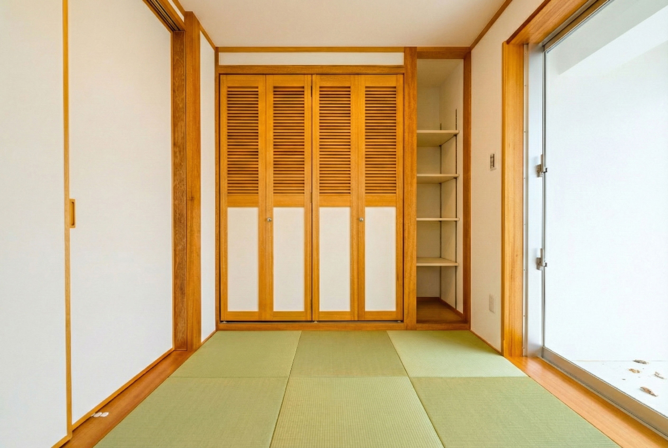 和室の仏壇用建具に、あえてルーバーと框のデザインを。和に寄せすぎないことで、空間に新しい表情をつくっています。